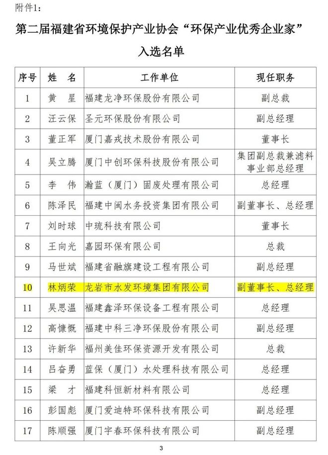 近日,福建省环境保护产业协会印发《关于发布第二届福建省环境保护产业协会“环保产业优秀企业家”评定及“优秀会员单位”表扬结果的通知》,龙岩市水发环境集团有限公司成功入选“优秀会员单位”名单,环境集团总经理林炳荣被授予“环保产业优秀企业家”荣誉称号,双项荣誉彰显行业认可。