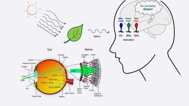 人类眼睛里有三种视锥细胞,分别对应蓝色波,绿色波和红色波。比如说,当我们看到树叶反射的光时,绿色视锥细胞会被点亮,向大脑传送信号,大脑分析之后告诉我们是绿色光。